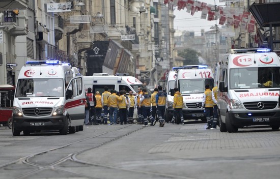قوات الشرطة التركية لدى معاينتها موقع التفجير الانتحاري في شارع الاستقلاب باسطنبول اليوم السبت. إي بي أيه