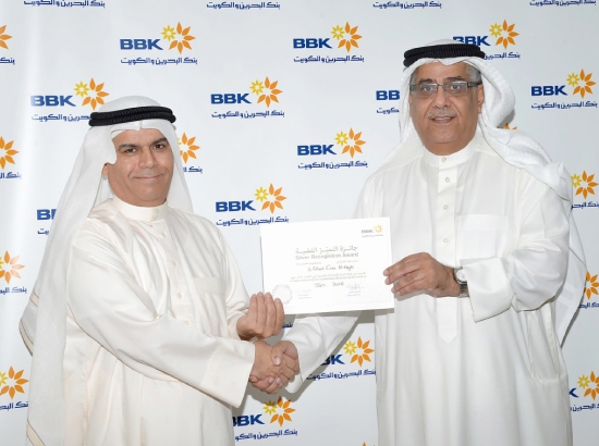 أقام بنك البحرين والكويت، البنك الرائد في مجال الخدمات المصرفية التجارية وخدمات الأفراد في البحرين «يوم التكريم» الشهري لإعلان الفائزين بالجائزة الذهبية والفضية ضمن برنامج تكريم الموظفين لشهر (يناير/ كانون الثاني 2016) في مقره الرئيسي في المنامة. وبهذه المناسبة قام الرئيس التنفيذي لبنك البحرين والكويت، عبدالكريم بوجيري، يوم الخميس (18 فبراير/ شباط 2016)، بتكريم الفائزة بالجائزة الذهبية وهي عبير سوار من سكرتارية مجلس الإدارة.
