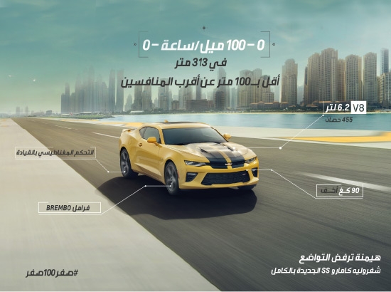 تأتي شفروليه كامارو SS 2016 لتثبت من جديد السبب الذي مكّنها، على مدى السنوات الخمس الماضية، من احتلال مركز الريادة في فئة السيارات الرياضية. وقد أثبتت كامارو SS 2016، المصممة لتكون أكثر خفة وقوة، مع تكنولوجيا أكثر تطوراً، قدراتها الجبارة من خلال اجتياز أقسى اختبارات 0-100 ميل/ ساعة-0.