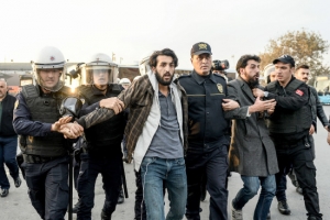 واندلعت اشتباكات طفيفة مع إلقاء محتجين زجاجات على الشرطة. واُعتقل محتج واحد على الأقل كما أصيب نحو 20 محتجاً برذاذ الفلفل.
