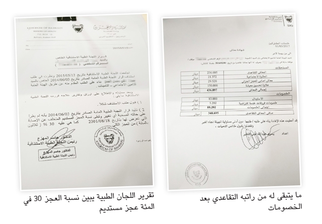 قامت اللجان على رفع نسبة العجز من 3 إلى 30 في المئة واعتبارها نسبة عجز كلي دائم والتعويض الشهري 29 ديناراً، وعلى ضوء ذلك حاولت من جهتي أن أستعين بمشورة أكثر من طبيب سواء في الخاص أم العام، وكان الجميع يؤكد استحالة توافر علاج جذري لهذه الإصابة التي ستظل محفورة في جسدي، عدا ما يمكن إحداثه عن طريق الجراحة من تطور يقتصر على تخفيف التورم والآلام؛ ولكن كل ذلك أساساً لا يعالج المشكلة جذرياً كي أعود إلى ماكنت عليه سابقاً إنساناً أمارس حياتي بشكلها الاعتيادي،فاستبعدت فكرة النظر في جدواها وإجرائها على رغم أن الحالة المرضية تطورت إلى مرحلة أسوأ لأن يتصادف أن أتعرض في أي وقت إلى سقوط مفاجئ بمجرد أن أشعر بوخز في القدم المصابة ذاتها، فأفقد المقدرة على التحكم بجسدي واختلال توازني مما يعرضني لأكثر من مرة الإصابة بحوادث سقوط، ولقد حصلت لي فعلياً حوادث أصبت على إثرها في مناطق عدة في جسدي، تارة في الفم وتهشم أسناني وتارة أخرى في الأنف واليد، وكانت أخطر إصابة تعرضت لها إثر عودة حالة السقوط المفاجئ هي كسر بمنطقة مفصل القدم ذاتها محل إصابة العمل السابقة، وما استدعى إخضاعي إلى جراحة وحاجة تركيب مسامير بالمكان ذاته، وصلت إلى مرحلة التقاعد المبكر منذ فترة وجيزة ما بعد شراء 5 سنوات.