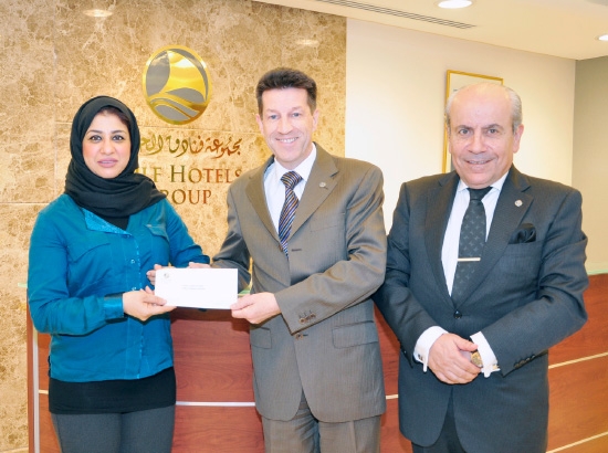 من منطلق المساهمة الفعالة والمتوالية لمجموعة فنادق الخليج ودعمها المستمر للمشروعات الخيرية بالمملكة، قام الرئيس التنفيذي لمجموعة فنادق الخليج، السيد جارفيلد جونز بتقديم شيك بمبلغ ألف دينار بحريني إلى عضو مجلس الإدارة والرئيس المالي لمبادرة «إبتسامة» التابعة لجمعية المستقبل الشبابية، صفاء إبراهيم الناصر، وذلك التزاماً من المجموعة بنشر قيم التكافل الاجتماعي والنهوض بالعمل الخيري والإنساني تجاه المجتمع.