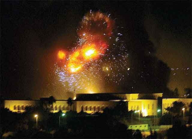 ودوت انفجارات قوية واشتعلت النيران وتصاعدت سحب الدخان المشرومية فوق وسط المدينة إذ قالت التقارير ان صواريخ ضربت «المجمع الرئاسي» وبنايات حكومية في وسط العاصمة في هجوم فاق بكثير هجمات الضربة الأولى. واندلعت النيران في البنايات المنهارة وهرعت سيارات الاسعاف الى مناطق مختلفة في انحاء المدينة وتحديدا في مناطق الدورة والروضة والرشيد.