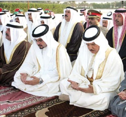 أدى عاهل البلاد جلالة الملك حمد بن عيسى آل خليفة يوم أمس صلاة عيد الفطر المبارك بمصلى العيد في قصر الصخير، بحضور ولي العهد سمو الشيخ سلمان بن حمد آل خليفة، وكبار أفراد العائلة المالكة ورئيسي مجلسي الشورى والنواب والوزراء وعميد السلك الدبلوماسي وكبار ضباط قوة الدفاع ووزارة الداخلية والحرس الوطني.