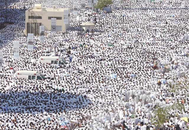 وفي مشهد جليل تجمع نحو ثلاثة ملايين حاج على صعيد عرفة حيث تحول جبل الرحمة والمنطقة المحيطة به إلى موجة مد بشري بيضاء لا فرق فيها بين غني وفقير أبيض أو أسود عربي أو أعجمي.