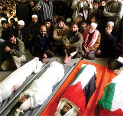 ففي جباليا حملت جثامين «الشهداء» الأطفال الأربعة وهم ديب دردونة وعمر دردونة وعلي منير دردونة ومحمد نعيم حمودة على النعوش بعد أن لفت بأعلام فلسطينية.