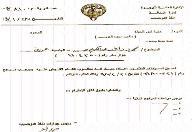 إلى ذلك حضر أمس المواطن محمود راشد عبدالكريم حسن إلى «الوسط» وقال إنه منع أيضا من دخول الكويت، وأحضر معه صورة عن رسالة موقعة من رئيس جوازات منفذ النويصيب في دولة الكويت، يخاطب فيها جهاز أمن الدولة هناك، ويذكر أن محمود راشد كان من ضمن قائمة الممنوعين منذ العام 1998.