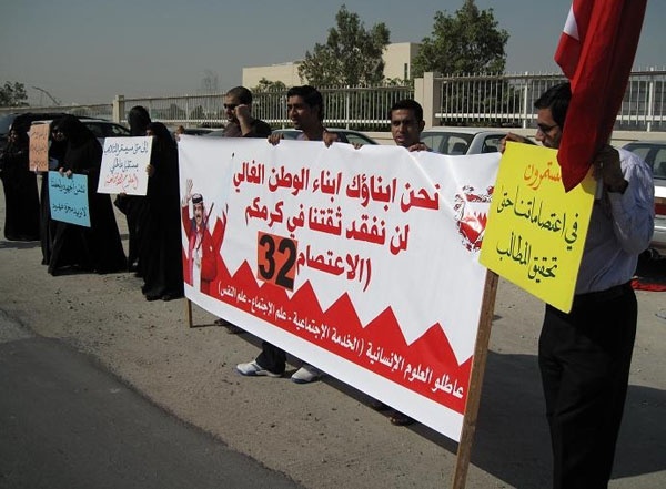نفذ عاطلو العلوم الإنسانية صباح اليوم (الإثنين)، اعتصامهم الـ 32 أمام مبنى وزارة التربية والتعليم في مدينة عيسى، واستمر الاعتصام قرابة ساعة كاملة، وشارك فيه عاطلون من خريجي التخصصات (علم النفس، علم الاجتماع والخدمة الاجتماعية).