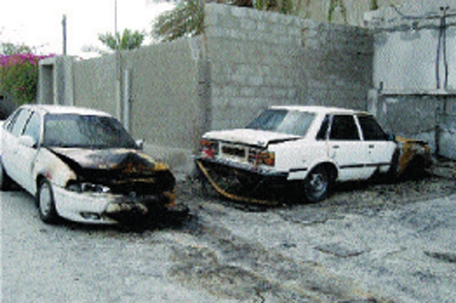 أقدم مجهولون على حرق سيارتين لعضو المجلس البلدي ممثل دائرة الرابعة بالمحافظة الشمالية محمد جابر الفردان بعد منتصف ليلة أمس الأول بمنطقة كرزكان.