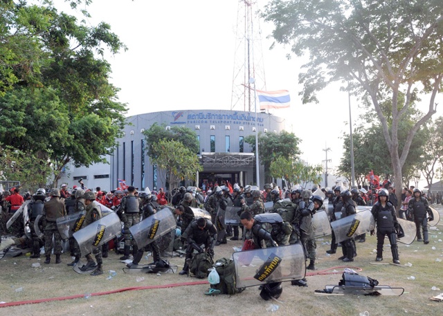 وبحسب الشرطة توجه نحو 12 ألفا من «القمصان الحمر» الذين يطالبون باستقالة رئيس الوزراء، ابهيسيت فيجاجيفا أمام مقر محطة «تايكوم» الفضائية (قناة الشعب) التي قطعت السلطات بثها أمس الأول. ويطالب المتظاهرون باستئناف برامج محطتهم التلفزيونية. وأفادت المراسلة أن نحو أربعة آلاف شرطي وعسكري استخدموا خراطيم المياه والغاز المسيل الدموع لتفريق المتظاهرين. وأظهرت مشاهد حية بثها التلفزيون متظاهرين داخل باحة مبنى قناة الشعب الذي كانت قوات الأمن تحرسه.