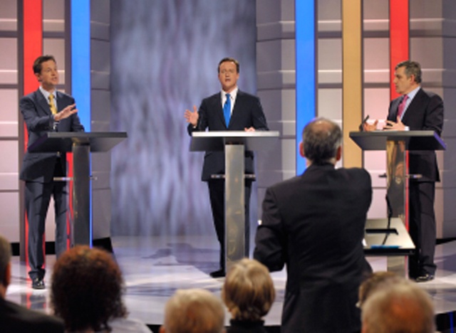 وأثناء المناظرة التي نظمت في أستيديو قناة «آي تي في» في مانشستر (شمال غرب) ووضع أثناءها المرشحون الثلاثة جنبا إلى جنب للرد على أسئلة الحضور، وعد رئيس الوزراء العمالي غوردون براون بـ «الازدهار للجميع» والمرشح المحافظ ديفيد كاميرون بـ «التغيير» والمرشح الليبرالي الديمقراطي نيك كليغ بـ «الإنصاف».