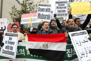 وواصل المتظاهرون تجمعهم في ميدان التحرير بقلب القاهرة مطالبين باسقاط الرئيس حسني مبارك ورافضين ان يحل محله اللواء عمر سليمان الذي عين نائبا للرئيس فيما استمرت الفوضى الامنية وقتل العشرات اثر عمليات هروب جماعي من السجون. ومساء الاحد، كلف مبارك رئيس وزرائه الجديد احمد شفيق الدفع باتجاه المزيد من الديموقراطية من خلال الحوار مع المعارضة واعادة الثقة باقتصاد البلاد، وذلك كما ورد في خطاب التكليف للحكومة.