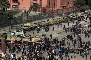 وكانت دبابات الجيش ما زالت منتشرة عند مداخل ميدان التحرير، وتحلقت مجموعات من الشباب حول النار، بينما هتف آخرون لمواصلة النضال في سبيل مصر ديمقراطية. وصباح السبت اذاع التلفزيون المصري بيانا هنأ فيه الشعب والجيش على نجاح "الثورة العظيمة".