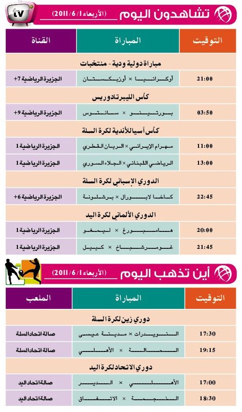 يضع الوسط الرياضي أمامكم برنامج اليوم الرياضي سواءً فيما يتعلق بالشأن العالمي أو المحلي.
