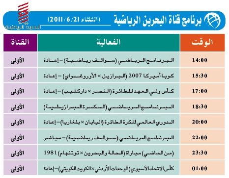 يضع الوسط الرياضي أمامكم برنامج اليوم الرياضي الكامل لقناة البحرين الرياضية لليوم الثلثاء الموافق 21/6. مشاهدة ممتعة نتمناها لكم أعزائي القراء.