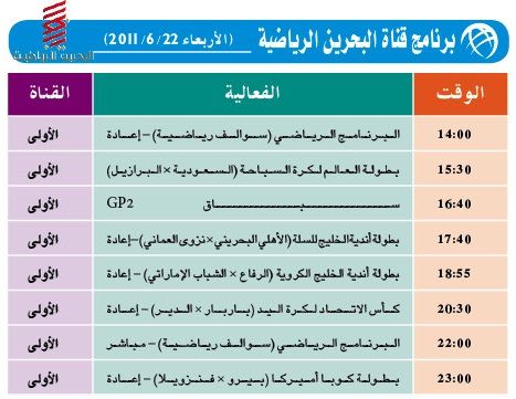 يضع الوسط الرياضي أمامكم برنامج اليوم الرياضي الكامل لقناة البحرين الرياضية لليوم الأربعاء الموافق 22/6. مشاهدة ممتعة نتمناها لكم أعزائي القراء.