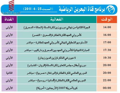 يضع الوسط الرياضي أمامكم برنامج اليوم الرياضي الكامل لقناة البحرين الرياضية لليوم السبت الموافق 25/6. مشاهدة ممتعة نتمناها لكم أعزائي القراء.