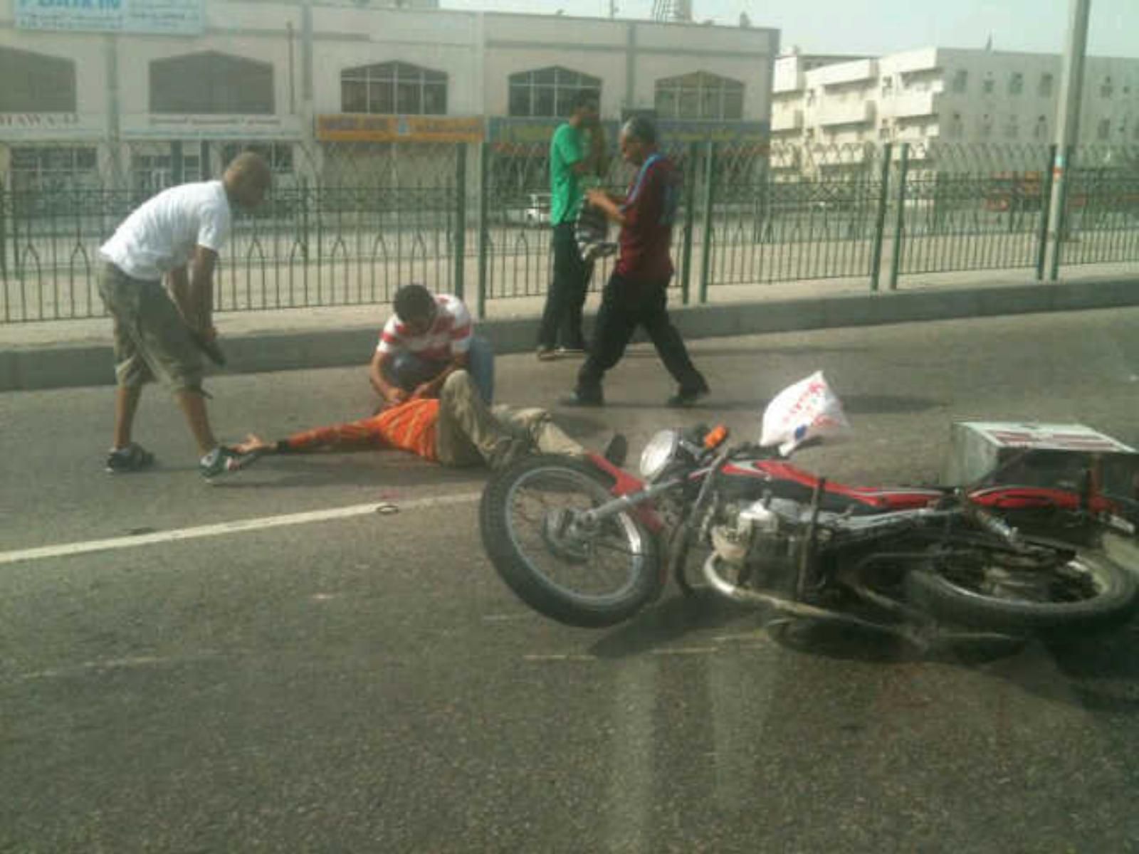 وكان الحادث وقع بين الدراجة النارية والسيارة بشارع الشيخ جابر الأحمد الصباح بالقرب من تقاطع الإشارة الضوئية لقرية المعامير، ما أدى الحادث لإصابة الآسيوي بإصابات متعددة بعد أن سقط وسط الشارع بعيد الارتطام، وعلى الفور توجه عدد من المارة وقاموا بتثبيت وضعه الصحي لحين وصول سيارة الإسعاف، حيث تم نقله للمستشفى لتلقي العلاج وقد وصفت حالته بالمستقرة، فيما باشر أفراد شرطة المرور التحقيق في ظروف وملابسات وقوع الحادث.