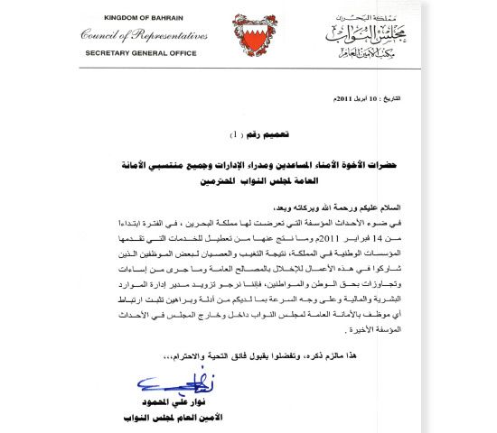 وأضافوا «ومما يؤسف له أن كتاباً رسمياً صدر بتاريخ 10 أبريل/ نيسان2011 من الجهات المعنية بالأمانة العامة بالمجلس (تعميم رقم 1 لسنة 2011) تدعو فيه الموظفين إلى «تزويد مدير إدارة الموارد البشرية والمالية وعلى وجه السرعة بما لديكم من أدلة وبراهين تثبت ارتباط أي موظف بالأمانة العامة لمجلس النواب داخل وخارج المجلس في الأحداث المؤسفة الأخيرة».
