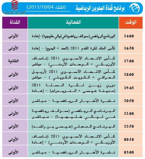 يضع الوسط الرياضي أمامكم برنامج اليوم الرياضي الكامل لقناة البحرين الرياضية لليوم الثلثاء الموافق 4/10. مشاهدة ممتعة نتمناها لكم أعزائي القراء.