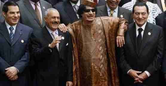 السبب على عدم مغادرة الرئيس اليمني من الحكم , لأنه مثبت بقوة من قبل القذافي و هو ضاغط على كتفه بيده اليمين .