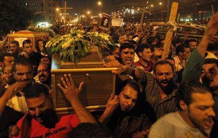 شارك الاف الاشخاص مساء الاثنين في كاتدرائية الاقباط بالقاهرة في تشييع 17 متظاهرا قتلوا الاحد في مواجهات اوقعت ما مجموعه 25 قتيلا، حسب الصور التي بثتها مباشرة محطة التلفزيون الخاصة "اون تي في". وكانت مواجهات قد وقعت الاحد خلال تظاهرة لاقباط كانوا يحتجون على حريق احدى كنائسهم في محافظة اسوان (جنوب). واوقعت المواجهات بين المتظاهرين وقوات الامن 25 قتيلا واكثر من 300 جريح.
