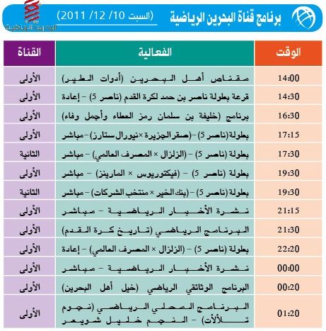 يضع الوسط الرياضي أمامكم برنامج اليوم الرياضي الكامل لقناة البحرين الرياضية لليوم السبت الموافق 10/12. مشاهدة ممتعة نتمناها لكم أعزائي القراء.