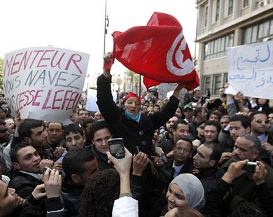 - 14: بن علي يفر الى السعودية تحت ضغط الشارع. فرض حال الطوارئ ورئيس الوزراء محمد الغنوشي يتولى الرئاسة الوقتية بعد اعلان "الشغور الوقتي" في الرئاسة.