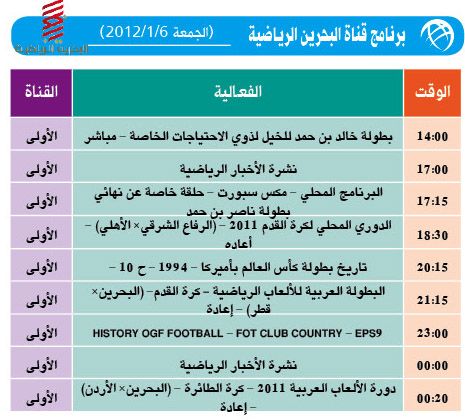 يضع الوسط الرياضي أمامكم برنامج اليوم الرياضي الكامل لقناةالبحرين الرياضية لليوم الجمعة الموافق 6/1.