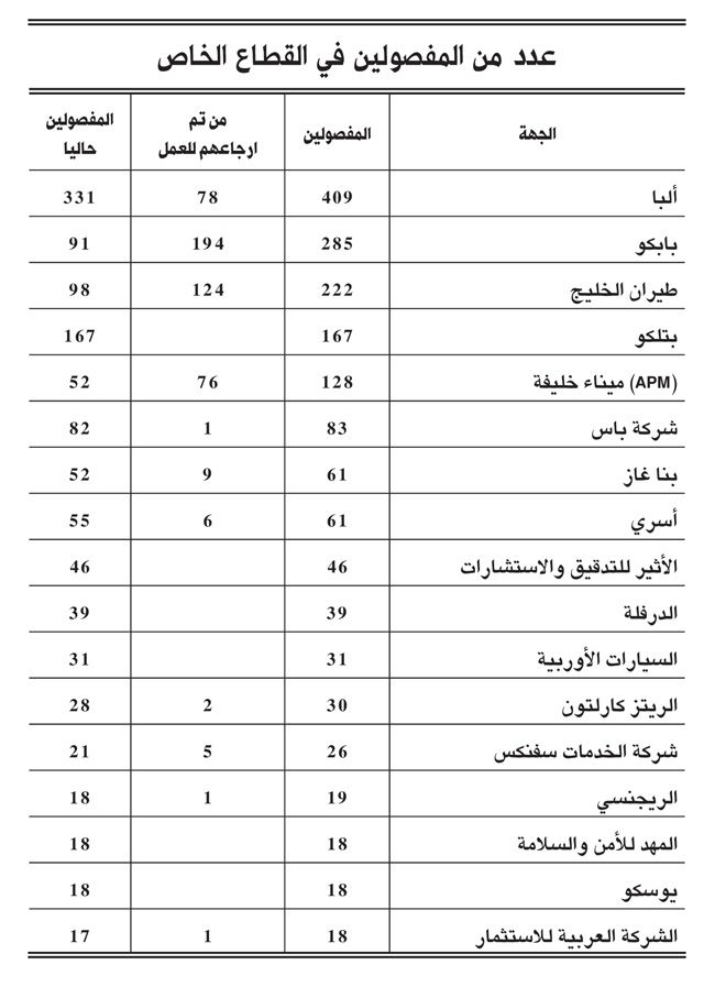 وفصلت الإحصائية أن مجموع المفصولين من القطاع الخاص وممتلكات بلغ 2107، عاد منهم للعمل 517 فيما لايزال 1590 آخرين مفصولين حالياً، الأمر الذي ساهم في التأثير على 10494 فرداً من أفراد عوائل المفصولين في هذا القطاع وممتلكات.