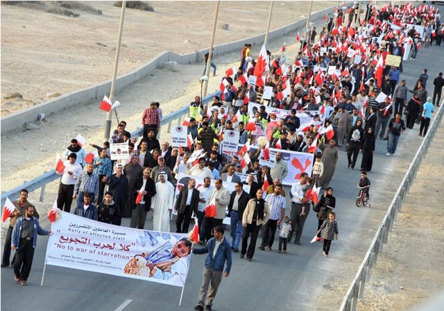 انطلقت مسيرة لمفصولين وموقوفين ومتضررين من القطاعين العام والخاص على خلفية الإحداث التي مرت بها مملكة البحرين منذ الرابع عشر من فبراير/ شباط الماضي، والتي تعد المسيرة الثانية في حدود وزارة العمل، رافعة شعار «كلا لحرب التجويع»، مؤكدة العودة بكرامة وحق التعويض ومحاسبة المتسببين في الفصل وإعلان الأرقام الحقيقية للعائدين.