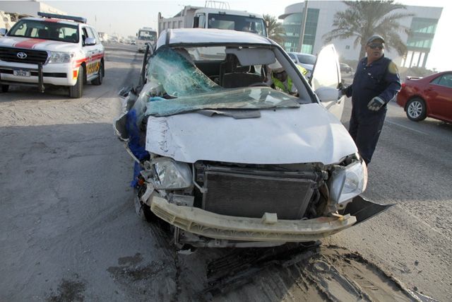 تعرض 3 أشخاص (مواطنة وطفلتها وسائق آسيوي) صباح أمس الثلثاء (17 يناير/ كانون الثاني 2012) لإصابات متفرقة، وذك إثر تصادم مركبتيهما بشارع الشيخ جابر الأحمد بسترة، وأسفر الحادث عن تلفيات تراوحت بين الجسيمة والمتوسطة بالمركبتين التي انقلبت إحداهما بعيد الارتطام بوسط الشارع ما أدى إلى ازدحام شديد بحركة السير قبل أن يتمكن أفراد شرطة المرور تدعمهم عدة دوريات للنجدة من تسهيل حركة السير بعد أن تولت الرافعة العمل على تعديل وضعية المركبة وإزاحتها عن الطريق، وقد بدأت الإدارة العامة للمرور تحقيقاً بشأن ظروف وملابسات وقوع الحادث