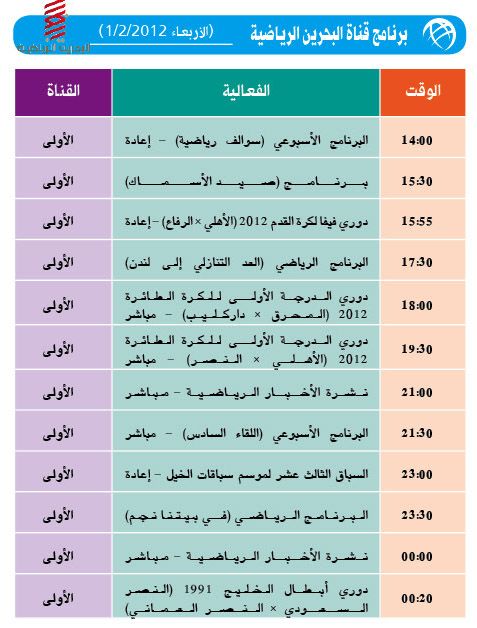 يضع "الوسط الرياضي" أمامكم برنامج اليوم الرياضي الكامل لقناة البحرين الرياضية لليوم الأربعاء الموافق 1/2. مشاهدة ممتعة نتمناها لكم أعزائي القراء.