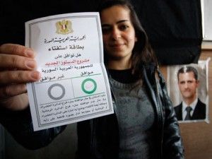 ذكر تقرير اخباري اليوم الاثنين أن الاستفتاء الذي جرى أمس في سورية على مشروع دستور جديد عبارة عن "مهزلة" حيث الاستفتاء يتم والمدفعية الحكومية تقصف المناطق السكنية وتقتل المدنيين في حمص وأدلب. ونشر موقع صحيفة الاندبندنت البريطانية صورة للرئيس السوري بشار الاسد برفقة زوجته وهو يدلي بصوته وصورة أخرى لأعمال عنف في احد الشوارع السورية.
