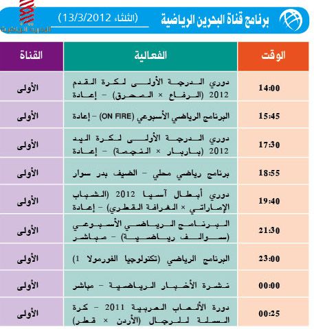 يضع الوسط الرياضي أمامكم برنامج اليوم الرياضي الكامل لقناة البحرين الرياضية لليوم الثلثاء الموافق 13/3. مشاهدة ممتعة نتمناها لكم أعزائي القراء.