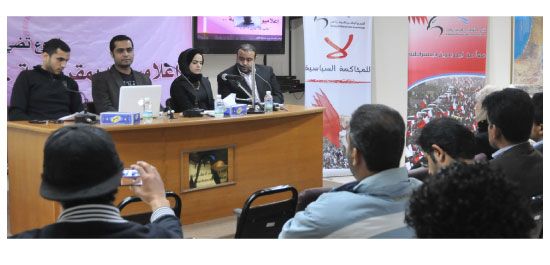 وفيما يتعلق بمسألة عدم وجود تحركات للإعلاميين، علق علاوي بأن ضعف التنسيق هو سبب عدم وجود تحركات إعلامية، فيما دعت السيد إلى العمل لإطلاق كيان إعلامي للدفاع عن حقوق الإعلاميين والتنسيق مع رابطة الصحافة البحرينية في الخارج.