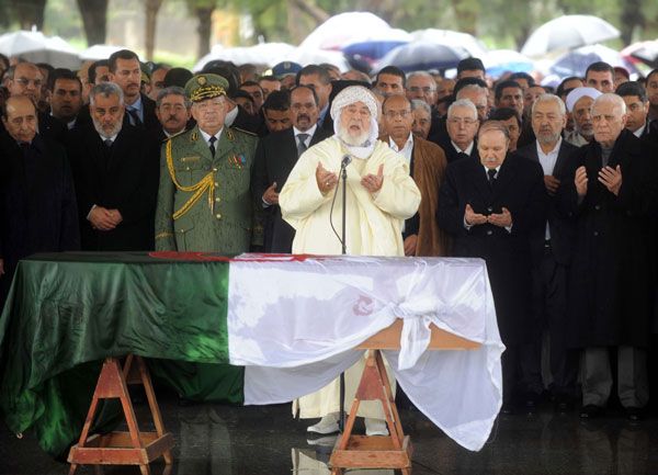 ووري اول رئيس للجزائر المستقلة احمد بن بلة الثرى بعد صلاة الجمعة بمربع الشهداء بمقبرة العالية شرق الجزائر العاصمة، بحضور الرئيس عبد العزيز بوتفليقة والرئيس التونسي منصف المرزوقي وعدد كبير من الشخصيات السياسية والدبلوماسية والعسكرية.