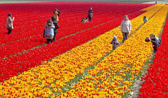 سياح بين زهور التوليب في أحد حقول الأزهار بهولندا