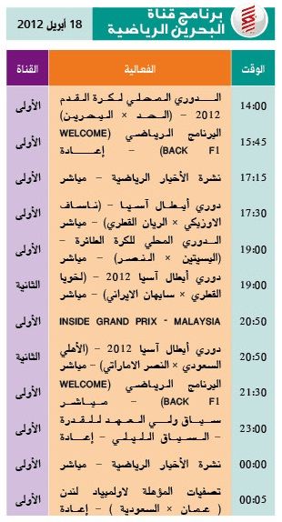يضع الوسط الرياضي أمامكم برنامج اليوم الرياضي الكامل لقناة البحرين الرياضية لليوم الأربعاء الموافق 18/4. مشاهدة ممتعة نتمناها لكم أعزائي القراء.