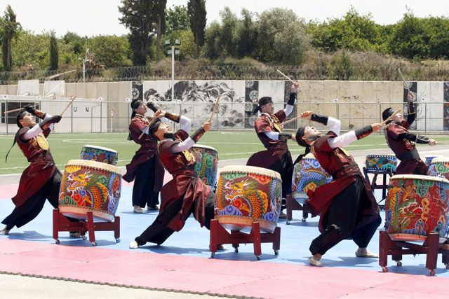 طبالون من كوريا الجنوبية خلال مراسم الاحتفال تكريماً لقتلى الحرب الكورية (1950 - 1953)، وذلك في بلدة طير دبا بجنوب لبنان حيث تتركز قوة كورية جنوبية لحفظ السلام