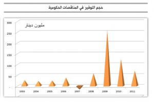 وقد بلغت القيمة الإجمالية للمناقصات التي تم إرساؤها في العام 2011 مبلغاً قدره 1.187 مليار دينار (ليبلغ مجموع المناقصات المرساة خلال الأعوام 2003 - 2011 مبلغ 8.038 مليار دينار). ولقد بلغت نسبة الارتفاع في عدد المناقصات التي تم إرساؤها 155 في المئة مقارنة بالعام 2003، وأشار المجلس إلى أن ذلك «يعد مؤشراً على زيادة الإنفاق الحكومي على مدى السنوات التسع الماضية».