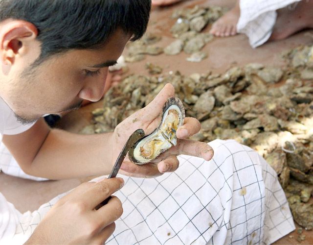 كويتي يقوم بفلق المحار بحثاً عن اللؤلؤ في ميناء الخيران الكويتي، وذلك بعد رحلة غوص تقام سنوياً ضمن المحافظة على التقاليد والتراث