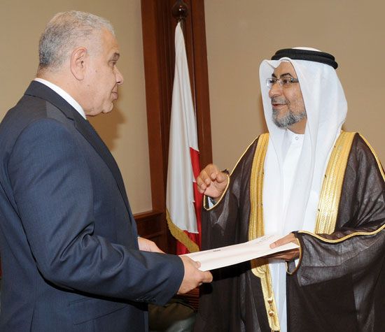 استقبل وزير الدولة للشئون الخارجية، غانم فضل البوعينين ، بمكتبه صباح اليوم الاثنين (17 سبتمبر / أيلول 2012) بديوان عام وزارة الخارجية، سفير جمهورية مصر العربية الجديد لدى مملكة البحرين، عصام صالح عواد مصطفى ، وتسلم نسخة من أوراق اعتماده كسفير لبلاده في مملكة البحرين.