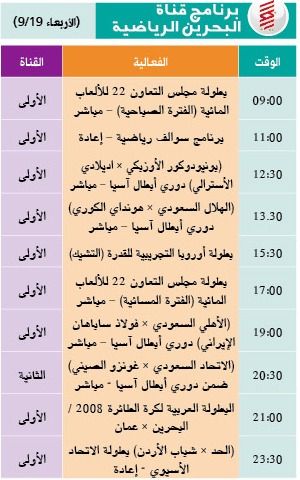 يضع الوسط الرياضي أمامكم أعزائنا القراء برنامج البث الخاص بقناة البحرين الرياضية الذي سيعرض اليوم (الأربعاء) الموافق 19 يوليو 2012... مشاهدة ممتعة نتمناها لكم أعزائنا القراء.