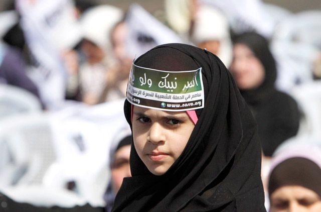 طفلة فلسطينية تشارك في مظاهرة ضد الفيلم المسيء للرسول (ص) أمس (الجمعة) في مدينة رام الله بالضفة الغربية
