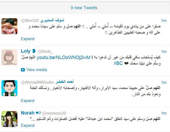 مع تنامي الاحتجاجات في العالم الإسلامي ضد الفيلم المسيء للنبي محمد (ص)، وضد المجلة الفرنسية التي نشرت رسوماً مسيئة للنبي محمد (ص) أيضاً؛ انطلقت حملة الكترونية للصلاة على النبي في موقع التواصل الاجتماعي (تويتر)، وشهدت تفاعلاً كبيراً من قبل المغردين في مختلف الدول الإسلامية.