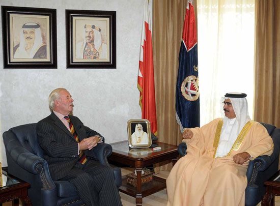 استقبل وزير الداخلية الفريق الركن الشيخ راشد بن عبدالله آل خليفة بمكتبه بديوان الوزارة صباح اليوم الأربعاء (3 أكتوبر / تشرين الأول 2012)، رئيس جمعية الصداقة البحرينية البريطانية بيتر سينوك وذلك بمناسبة زيارته لمملكة البحرين.