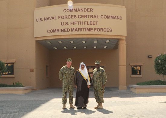 ألتقى رئيس هيئة شئون الاعلام الشيخ فواز بن محمد آل خليفة، الأدميرال جون ميلر قائد القوات البحرية المركزية الأميركية قائد الأسطول الخامس وكيفين سكوت نائب الادميرال في القوات البحرية المركزية صباح اليوم الأربعاء (3 أكتوبر / تشرين الأول 2012) وذلك في وحدة الإسناد البحري الأميركية.