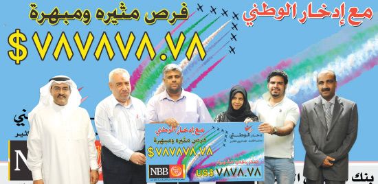 أعلن بنك البحرين الوطني أسماء الفائزين في برنامج ادخار الوطني لشهر سبتمبر/ أيلول 2012، حيث فاز خلال السحب الذي جرى في المقر الرئيسي للبنك بالمنامة كل من يوسف عيسى أحمد علي، وفاطمة عيسى علي هرونة، وفاضل عباس غلوم علي، وجواهر أحمد بوعلي بن نوح، وسارة عبدالنبي علي الغريفي، بمبلغ 7878,78 دولار أميركي لكل منهم.