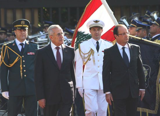وفور وصوله الى مطار بيروت توجه الرئيس الفرنسي الى القصر الجمهوري حيث بدأت جولة المحادثات المغلقة مع الرئيس ميشال سليمان على ان يعقد اولوند مؤتمرا صحفيا في ختام الزيارة التي تستغرق ثلاث ساعات.